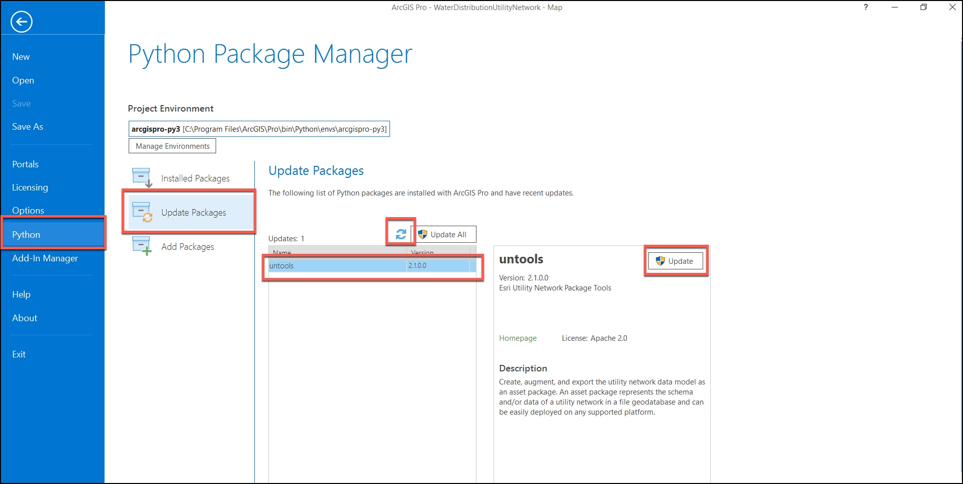 In ArcGIS Pro, click the Project Tab and then click Python. In the Python Package Manager, select Update Packages and click the Refresh symbol. Select untools and click Update. After the update completes the Utility Network Package Tools version will increment to 2.1.0.1.