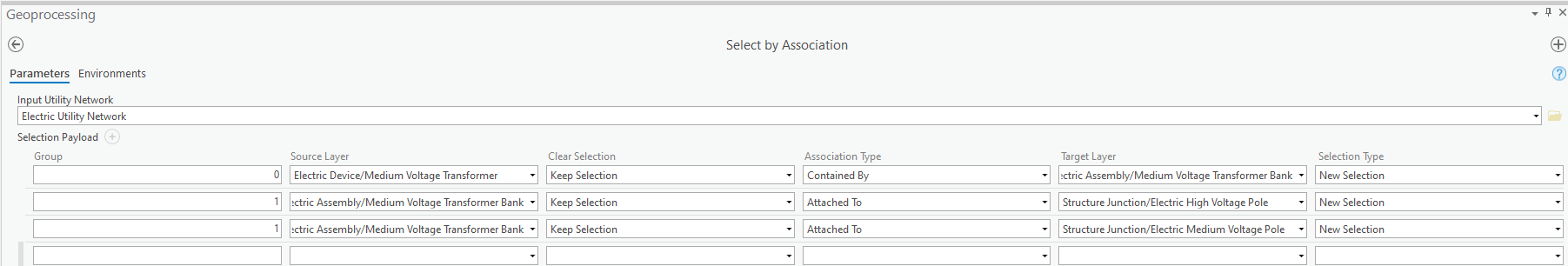A new user interface has been added to make the tool easier and faster to use. This tool previously required you to input a json string to select associated features. This is still supported and provides advanced control over selected features. In the example below, we configured the tool to first select all MV Transformer assemblies. We set its group value to 0, so that this selection is preformed first and independent of the other rows. Then we select the HV and MV poles that the assembly is attached to. The group value is set to 1, so these selections are run together.
