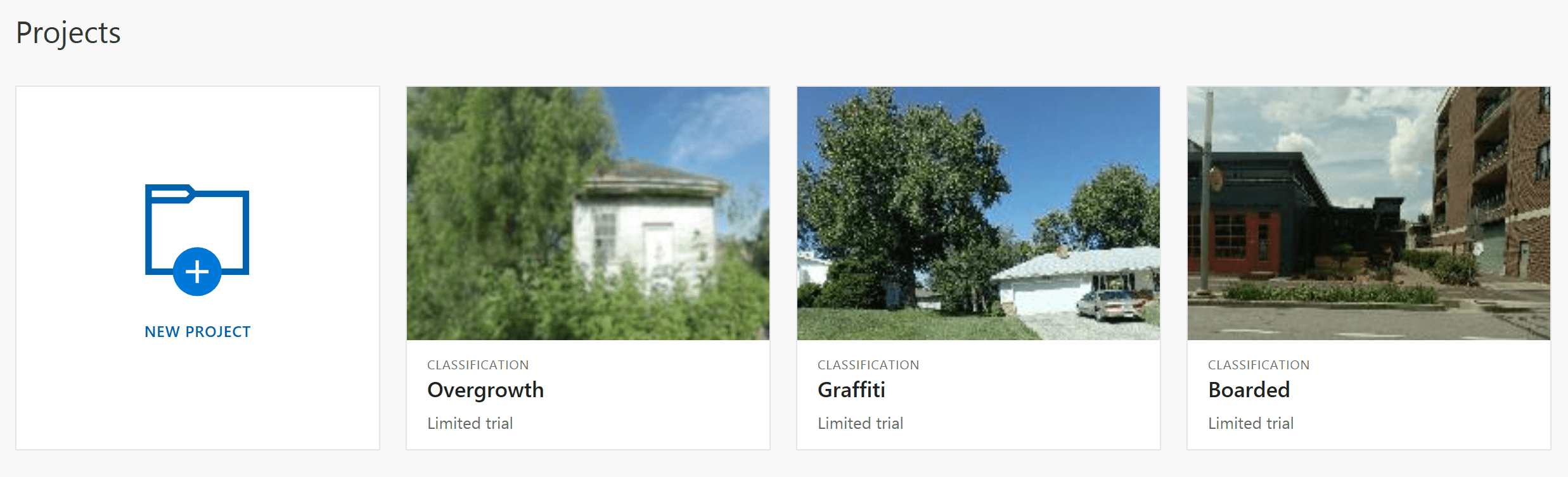 Once you have published your street-level photo collection, you can employ Microsoft’s Custom Vision service to calculate probability scores for graffiti, boarded windows, and overgrown yards. Custom Vision lets you build custom image classifiers, which works well for blight identification.