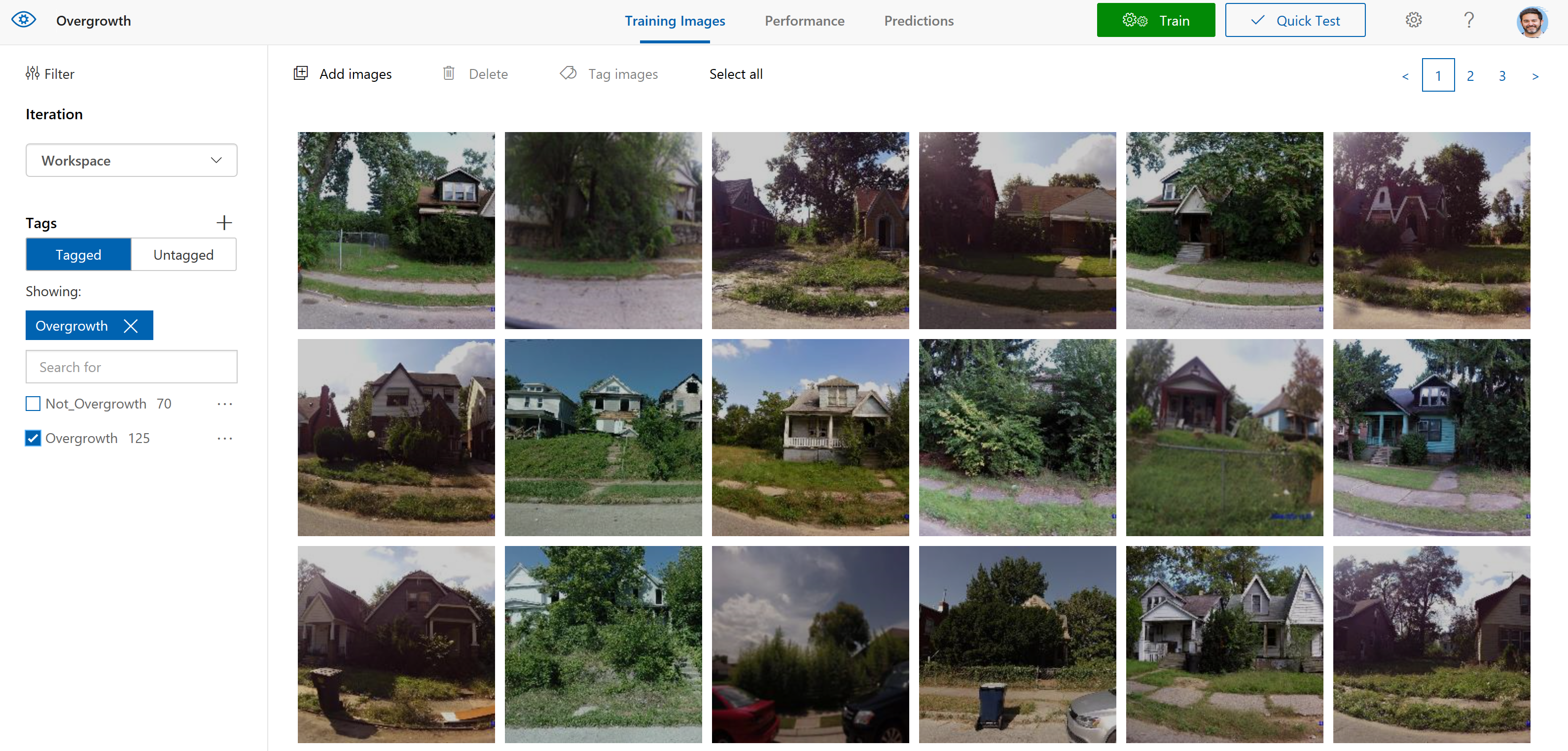The process is so simple that you do not need to be a data scientist, but if you are – you’ll find the tools easy to use, and the models easy to update and customize. Gathering photos to train the AI is a time-consuming task, so we took care of that for you by providing a set of training photos. The included training photos represent typical blight categories (graffiti, boarded windows, overgrowth), and the tools will automatically create and train the models required by Custom Vision. You can further train the AI with your own photos or add more blight categories.