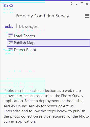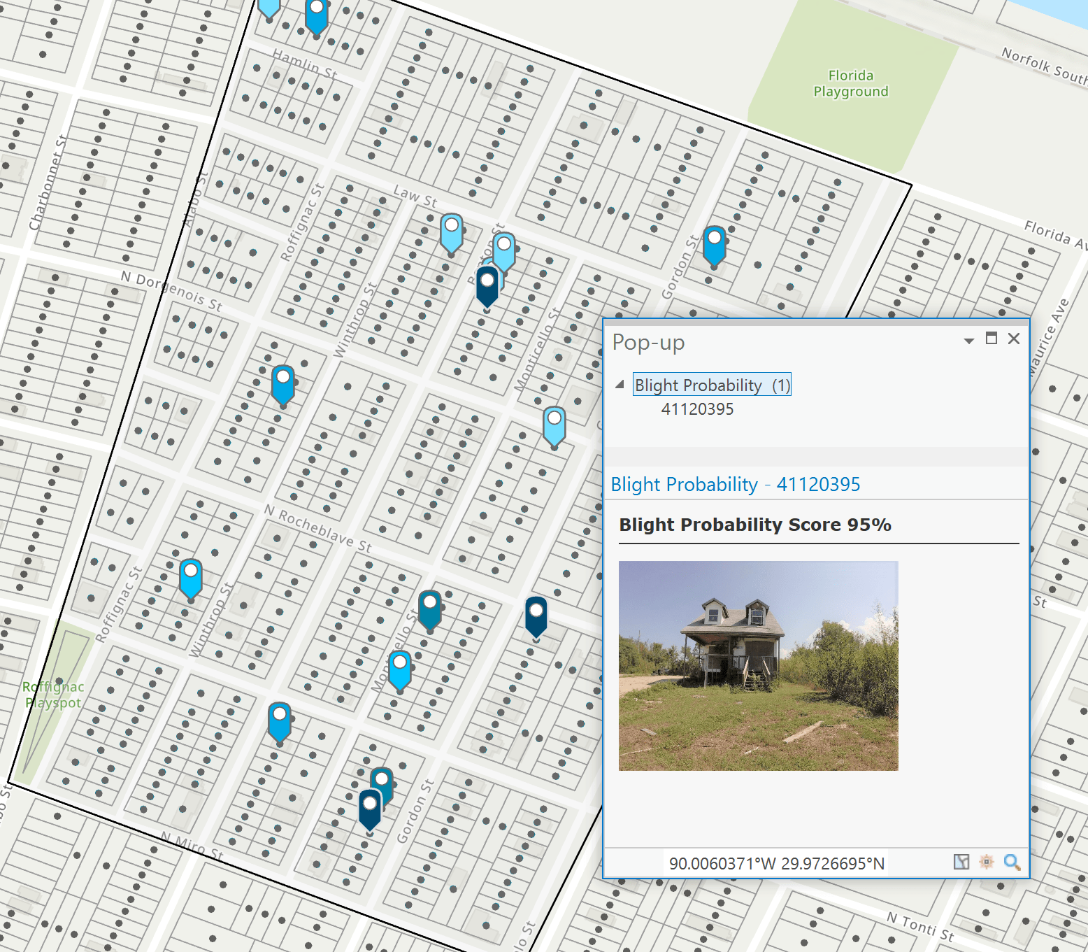 The Property Condition Survey configuration available with ArcGIS significantly reduces the time and cost associated with performing property surveys by applying artificial intelligence (AI) and machine learning (ML) to street-level property photos and automatically calculate a blight probability for every property. Once blight probabilities are calculated communities can take action against individual properties to fix blight or make policy changes to reverse neighborhoods that are blighted or trending toward blighted. After performing an initial survey and establishing a baseline, communities can rapidly resurvey in the future to track blight trends over time.
