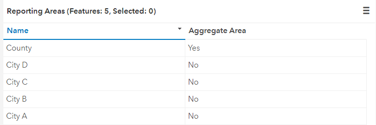 Reporting Areas are the geographic boundary (or boundaries) on which you’d like to share COVID-19 case and testing data. A reporting area can be a county, zip code, state, municipality or any other area you are using to tabulate case data. The Reporting Areas layer includes two important fields: Name and Aggregate Area. Name – straightforwardly enough – stores the names of the reporting area. The Aggregate Area field is used when you’d like to report case data by differing jurisdictions. For example, a county might want to share case data tabulated by the entire county as well as broken down by zip code or municipality. In that case, a feature representing each reporting area would be added to the Reporting Areas layer with the Aggregate Area field populated with Yes like the below screenshot.