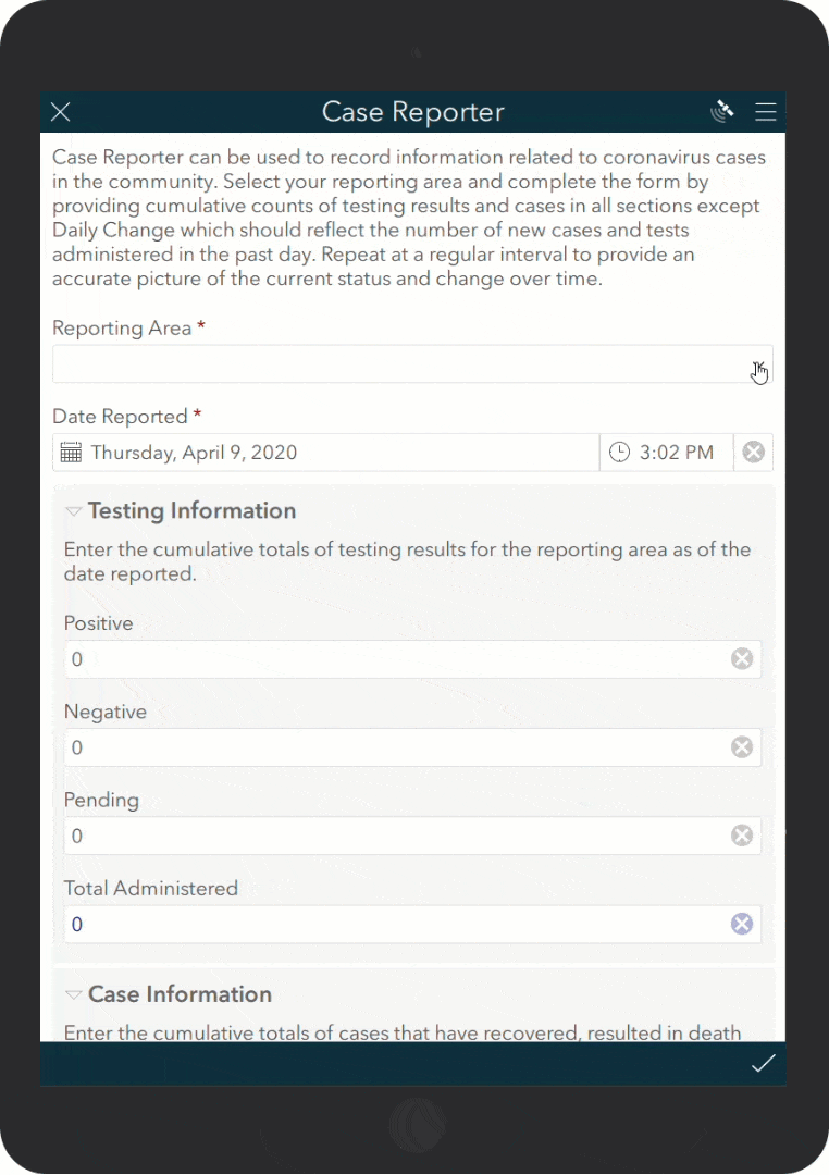 In addition to the CoronavirusCaseSources CSV table, the Case Reporter application can be used by public health staff to tabulate COVID-19 cases. Case Reporter can be used to record information related to COVID-19 cases per reporting area. Each section of the Case Reporter form provides fields for entering cumulative totals as of the report date except the Daily Change section which should reflect the number of new cases and tests administered in the past day.