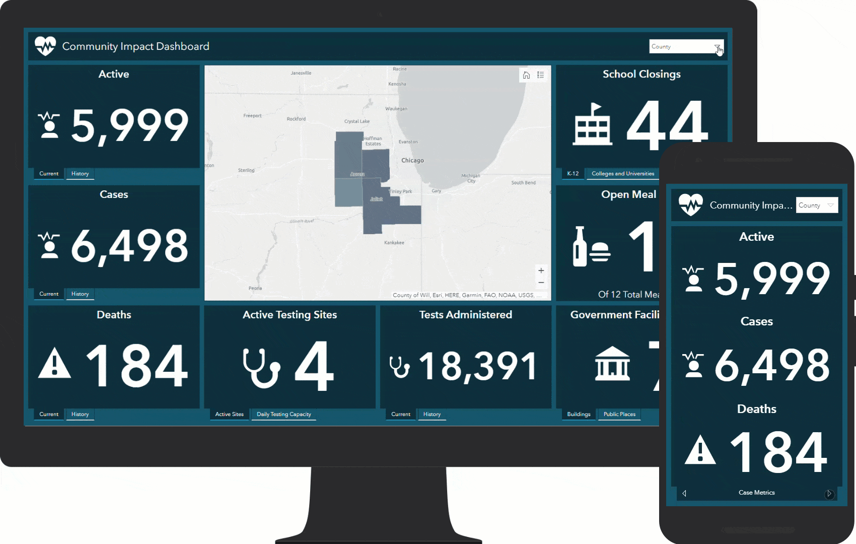 In response to the Coronavirus 2019 (COVID-19) pandemic public health agencies are working to share timely and accurate information with their communities. ArcGIS provides powerful tools to tabulate, visualize, and share COVID-19 data with the public. In order to help public health agencies and officials quickly deploy and share their authoritative data, the second release of the Coronavirus Response solution includes two ArcGIS Dashboard configurations: Community Impact Dashboard and Coronavirus Case Dashboard. The Community Impact Dashboard is designed to help public health agencies share basic COVID-19 testing and case metrics along with other key community information such as school closings and meal sites. The Coronavirus Case Dashboard is designed to allow public health agencies to share more detailed COVID-19 testing and case metrics with the public. Additionally, the Coronavirus Response solution includes mobile versions of both the Community Impact Dashboard and the Coronavirus Case Dashboard. Either or both can be configured and shared to keep your community informed during the COVID-19 pandemic.
