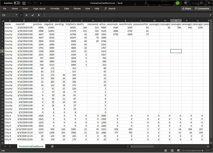 Unfortunately, the COVID-19 pandemic has now been with us for quite a while which means you may want to enter a larger amount of data at once so that the Coronavirus Case Dashboard or Community Impact Dashboard accurately display historical reports. Included with the Coronavirus Response solution is the CoronavirusCaseSources CSV table. Download the CoronavirusCaseSources CSV table from your ArcGIS Organization to tabulate COVID-19 data within Microsoft Excel. Use the table to populate date for each reporting area and report date. Importantly, values in the name column should match the values populated in the Reporting Areas layer name field.