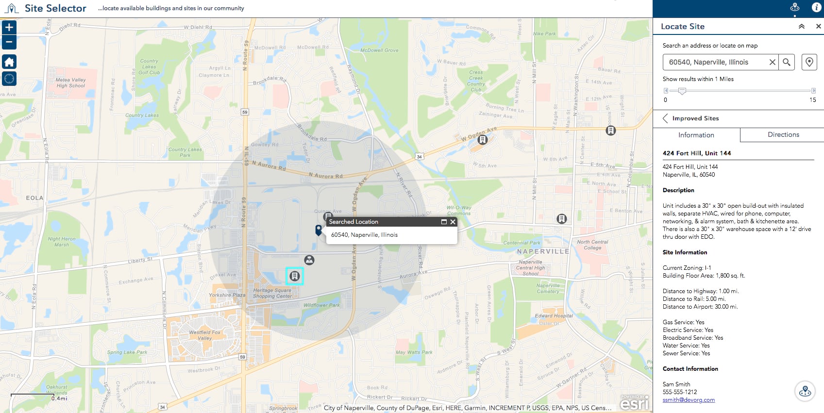 Site Selector (Web AppBuilder for ArcGIS) helps businesses locate available buildings and sites in a community