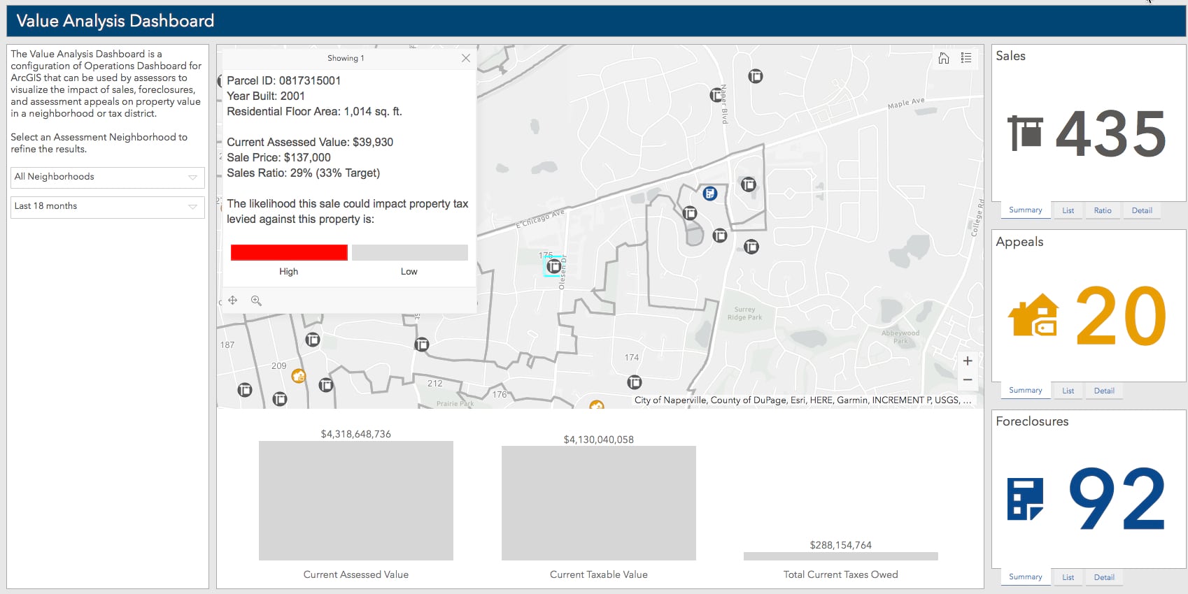 Value Analysis Dashboard (V2) enables assessors to visualize the impacts of property sales, foreclosures, and appeals on property values