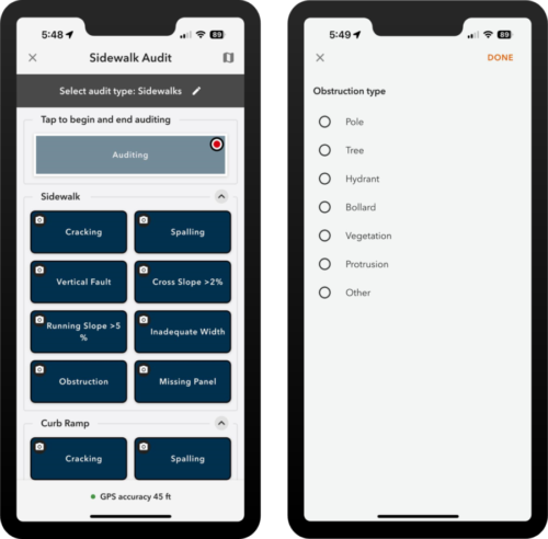 The solution’s ArcGIS QuickCapture project allows maintenance staff to walk around the community and easily identify sidewalk and curb ramp defects and compliance issues at speed. Then, you can use this information to score sidewalk and curb ramp conditions and identify problem areas each time an audit is conducted.