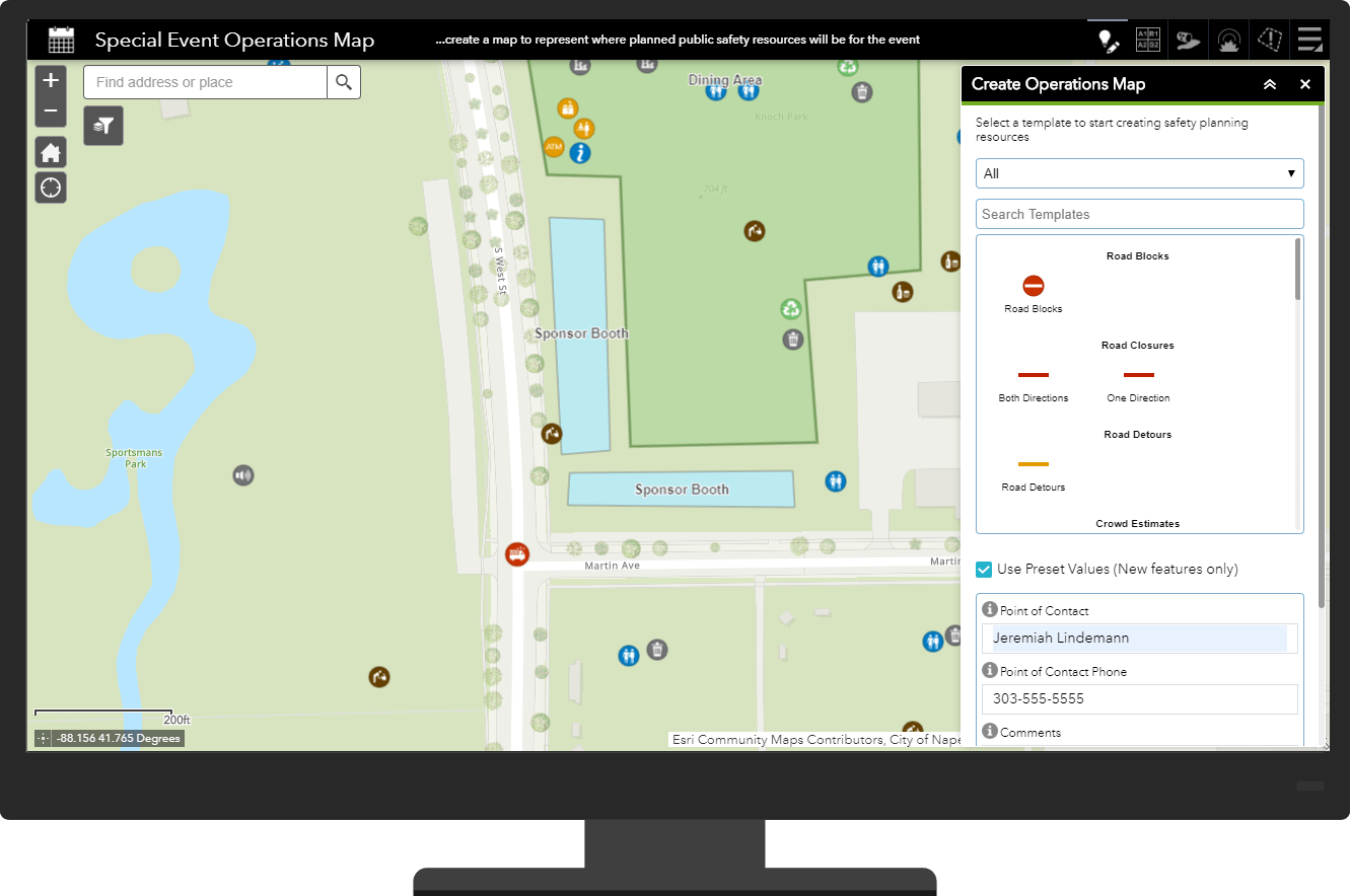 With an operations plan in place, monitoring the event and adjusting the plan in real-time is critical. Special Event Permitting and Operations helps you create a unique set of health and safety operations applications for each event that can be used to collect information from the field and maintain situational awareness. This collection of operations maps and applications help health and safety personnel: