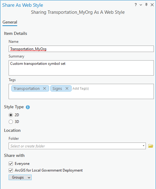 In the Share pane, add your title, summary, and tags for the web style, and make sure the style type is set to 2D. Then, update Share with to share the style with the group that will make the web style available for use in Map Viewer and other applications.