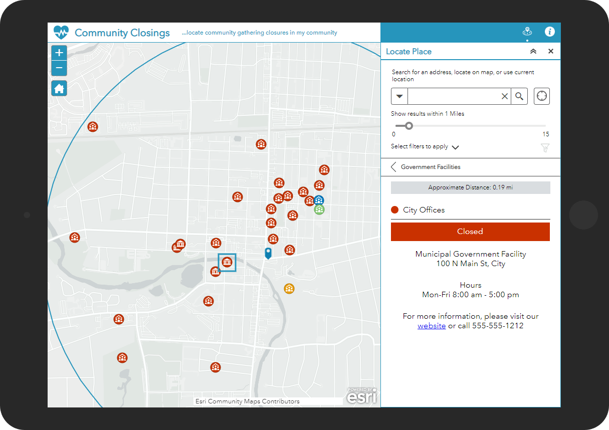 Community Closings – a web application that informs the public about the status of community gathering places such as government buildings, parks, care centers, libraries, food banks, and the like.