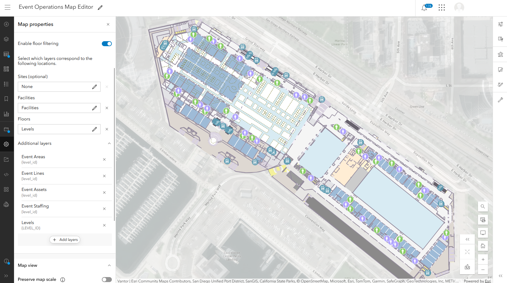 To begin extending the Special Event Operations with indoor mapping, your indoor event venue layers must be added to three of the solution’s web maps and floor filtering must be enabled on selected layers in each web map.