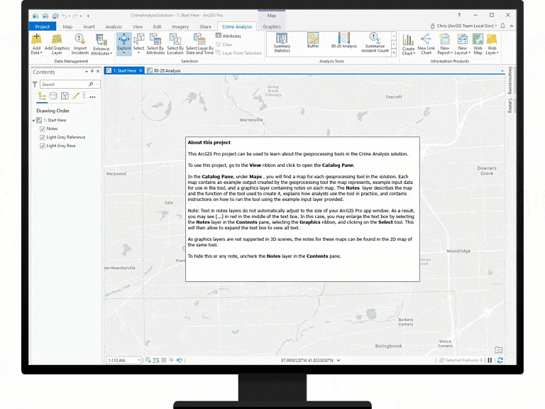 To help you learn how to use Crime Analysis, we have enhanced the ArcGIS Pro project included in the solution. The project includes example maps for each tool in the solution; input data to help you try running the tool; and notes explaining what the tool does, how it is used in crime analysis, and how to run the tool with the sample data. The ArcGIS Pro project is intended to help you jump-start your self-directed learning process, so you can be productive with Crime Analysis immediately. For further training, we have a learning path containing a series of lessons to help grow your skills with the Crime Analysis solution.