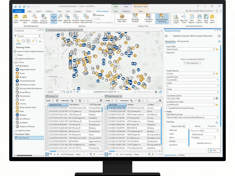 - Automate your work: Did you know that ArcGIS Pro now has built-in tools to automatically run any geoprocessing tool on a regular schedule? Crime analysts can use ArcGIS Pro scheduling tools to save time by automating their data import and cleaning processes, generate kernel density or other analytical products, and export reports and hard-copy maps. Additionally, Crime Analysis now includes Update Features With Incident Records, a tool that can be used to import data from a spreadsheet, CSV file, or database (or Microsoft Access) table, map records using addresses or x,y coordinates, and update an existing local or web layer. This tool can be used with ArcGIS Pro scheduling tools to perform daily imports of data to your desktop or Web GIS from your records management system or computer-aided dispatch system.
