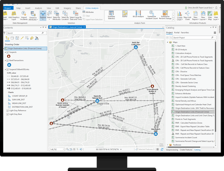 - Perform link analysis: Visualize the relationships of people, events, and places during an investigation, and conduct analysis to find patterns using the link analysis methods, including path analysis, centrality analysis, clustering analysis, and neighborhood analysis. Link analysis supports your layers and nonspatial tables and allows you to define relationships to connect the layers and tables. Link analysis leverages link charts that can be visualized clustered, hierarchically, or organically, and you can make selections in the link chart and see the same selection on your map. Link charts can be exported to be included in printed or static reports or briefings.