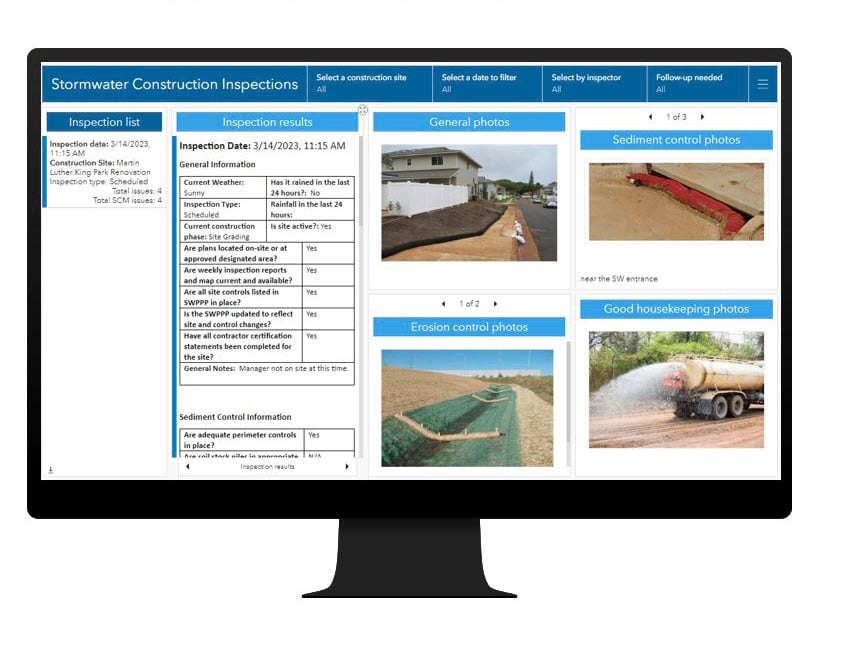 Inspecting construction sites for stormwater compliance can be tricky. Fortunately, you don’t need to control weather to successfully conduct routine site inspections. You just need to deploy the Stormwater Construction Activity Management solution. This stand-alone ArcGIS Online solution delivers capabilities that help stormwater managers assign and manage regular inspections, understand effectiveness of stormwater control measures on a site, and observe sediment and erosion control on construction sites. Additional capabilities help fieldworkers record inspections and provide actionable reports while still in the field.