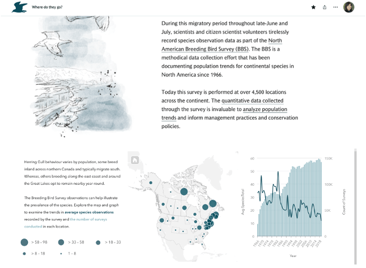 Next on our list is ArcGIS Insights, which combines data visualization and analysis to help with your decision-making. When you embed your maps, charts, or tables into your story, you give your readers access to your data, exploring patterns and trends right in the narrative. Another good example is Where do they go? This story explores bird migration and populations with ArcGIS Insights. Throughout the story, the author provides valuable context related to migration patterns by using interactive data visualizations with maps of bird populations and graphs of survey counts throughout the years.
