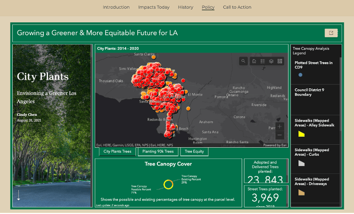ArcGIS Dashboards is another app storytellers have been able to integrate into their stories. Shade Equity in LA is an example showing how a dashboard can provide all kinds of data and interactive widgets from a single page. The dashboard in this story displays the existing tree canopy and the potential trees that can be planted in certain parts of Los Angeles to create a greener and more equitable environment.