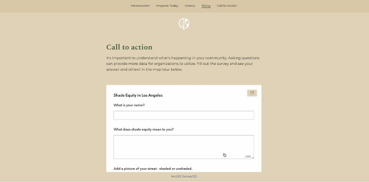 Dashboards also integrate Survey123 to collect data from the neighborhood related to the number of trees and what shade conditions are like around the city and record this as a map tour point within the story.