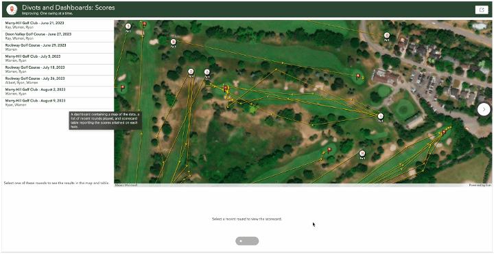 A bonus example to show off some great ArcGIS Dashboards is with Divots & Dashboards. This story combines golfing and data-driven insights all in one! Not only does the story include dashboards, it also takes advantage of using ArcGIS QuickCapture. With ArcGIS QuickCapture, you can easily select a template or ArcGIS feature layers to configure your first data collection project in the designer and customize buttons, attributes, and actions without writing a single line of code! The author used ArcGIS QuickCapture to collect their data like the location of each swing the author took on the course, the clubs they chose, and how many shots were taken throughout the 18 holes.