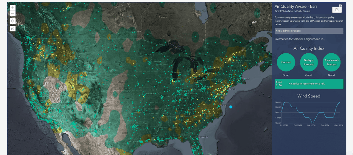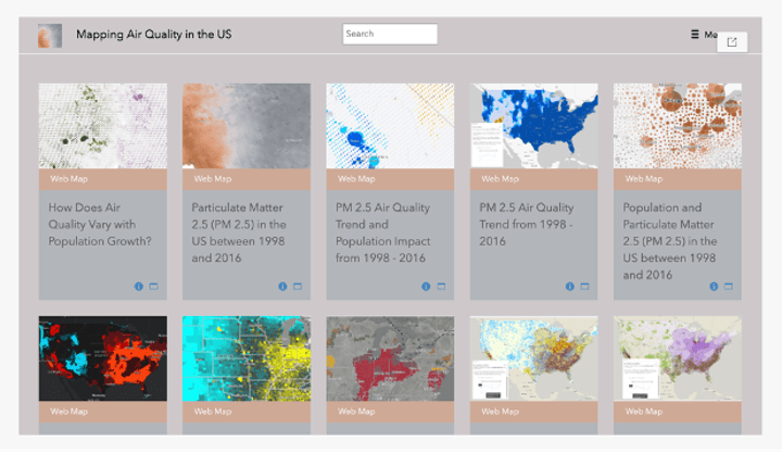 For our final integration of ArcGIS Apps into your stories, we have ArcGIS Instant Apps. You can utilize Instant Apps to share your maps and provide your audience with an intuitive experience to engage with your data and maps with a gallery of modernized no-code app templates to customize your app. Instant Apps offer greater flexibility and customization to specific workflows, like with The air we breathe, where the author integrates their maps into their story seamlessly to demonstrate air quality throughout the United States. The customized popups and templates used help the audience understand the data in a clear and straightforward way.