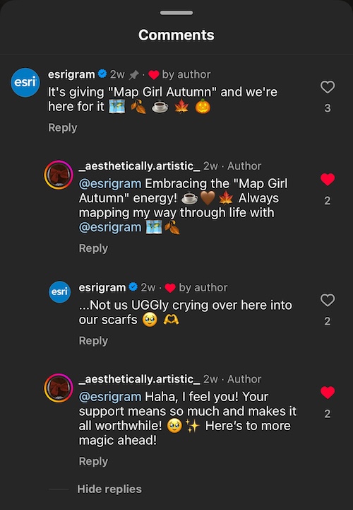 Esri experimented with TikTok for a while, and Esri turned over the strategy and videos to me. It was a really useful pilot as we engaged younger, non-GIS audiences and our traditional users through a non-traditional platform. And when the pilot ended, I had the opportunity to apply those video skills and creativity to @Esrigram.