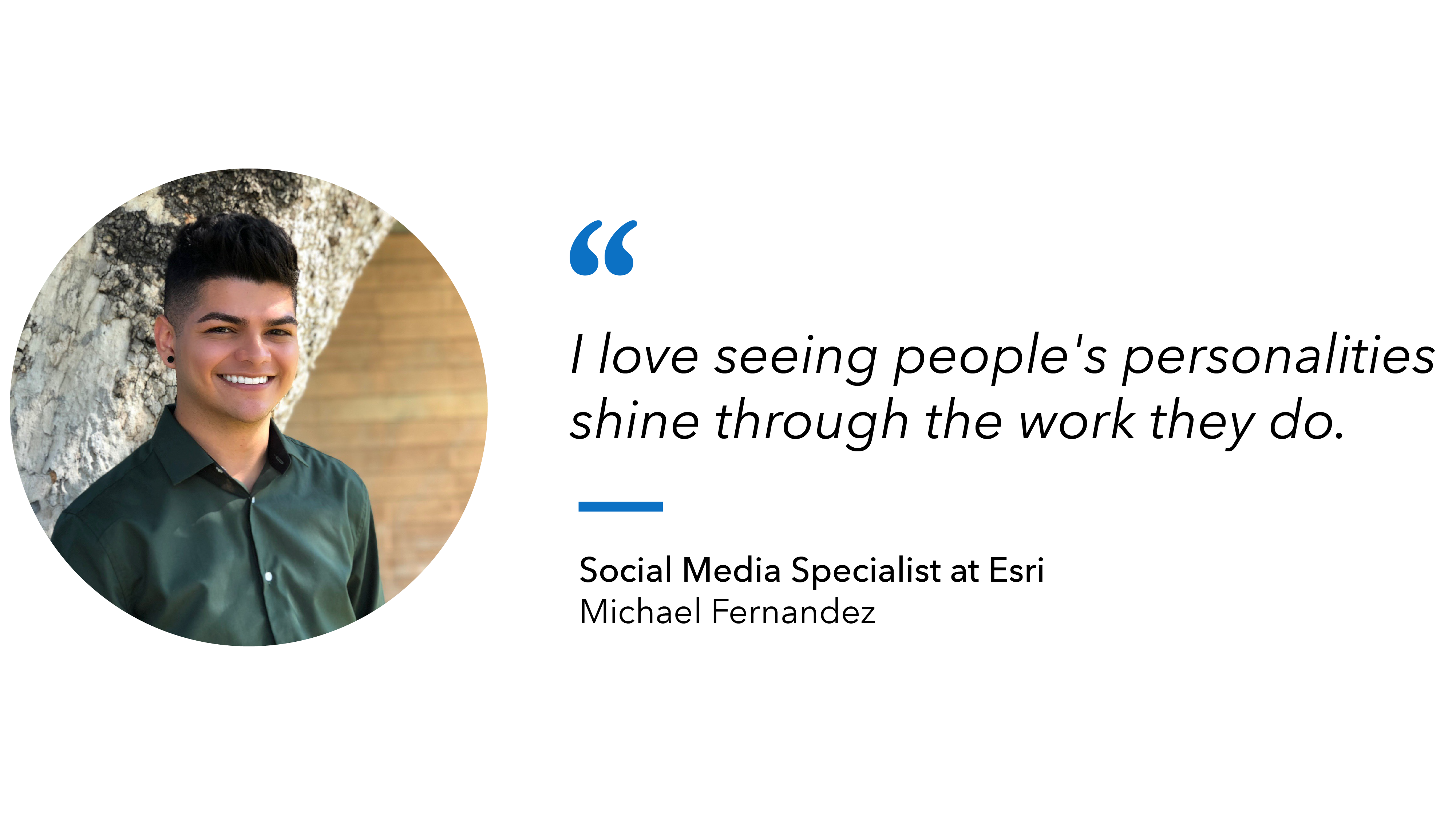 I didn’t know much about Esri or GIS, but I saw that as a challenge. It was exciting to apply my interests in marketing, communications, and social media to an industry I never thought I’d be involved in. I’ve been here for five and a half years, and there are always new things to learn. I see it as an opportunity to understand better what people are sharing, showcasing, or telling the community