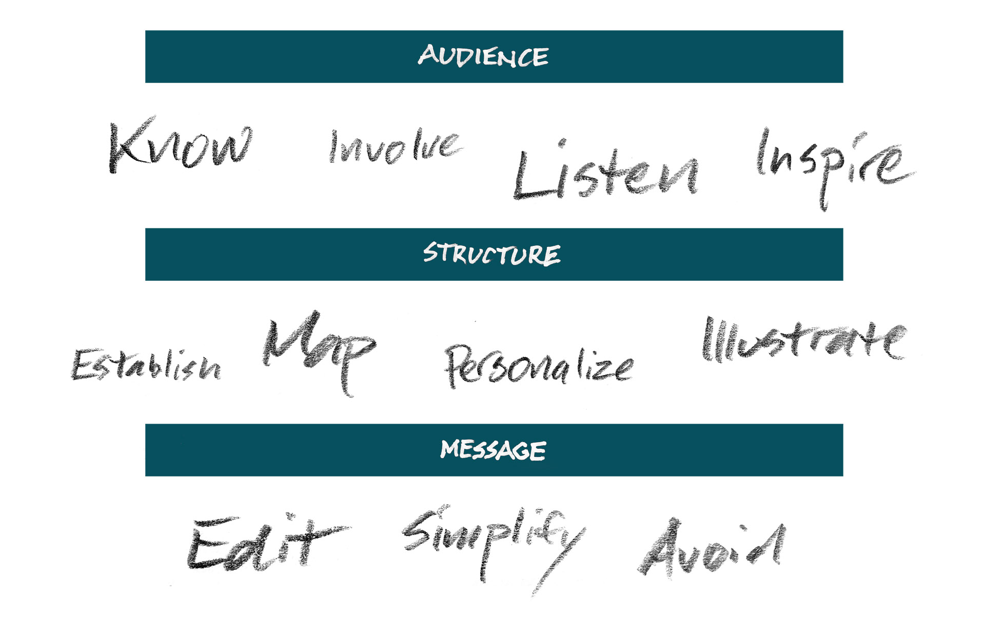 After several rounds of discussion, we came up with 11 items, which we sorted into three categories. We thought it might be engaging to present the items in the form of verbs, since storytelling—and planning a story—are active processes. The categories, or principles, helped organize our thinking, and we hope they will be helpful to yours as well.