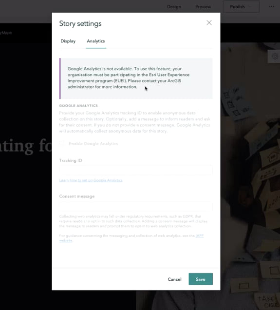 If your organization is not part of Esri User Experience Improvement program (EUEI) you will receive a notice saying “Google Analytics is not available…” You must enroll in the program to be able to use Google Analytics in your account. Your ArcGIS administrator will be able to enable this for you by opting into the Esri User Experience Improvement program. This is a protection for organization accounts to have more control over how data is collected using Esri tools.