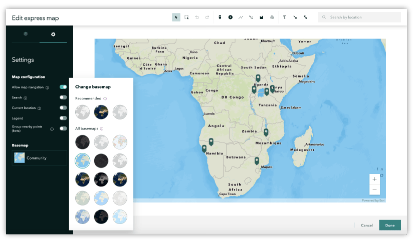 Many of you have asked for more choice in basemap selection for express maps. In this update, you can now select from more than a dozen gorgeous vector basemaps for your express maps. These additional choices are also available in the map settings for guided tours.