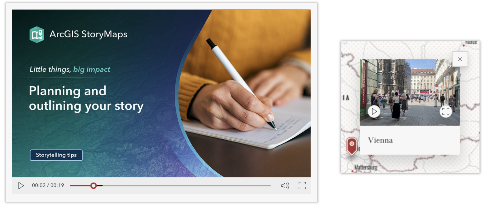 Now, when you add a video to the body of your story, briefing, collection, or an immersive block, the player is equipped with a docked control bar that fits your video to preserve its full dimensions. When you add a video to an express map pop-up, the controls are simplified for a better viewing experience; the video can be expanded to access the full range of controls.