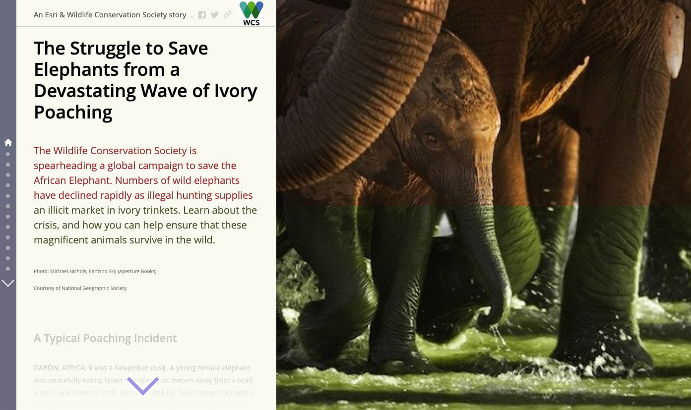 Map Tour, together with our continuing experimentation, spawned additional storytelling templates that presented place-based narratives in a variety of ways. Story Map Journal was released in 2015 along with an example story we co-produced with the Wildlife Conservation Society. Journal was a breakthrough for us; its versatility and more sophisticated builder helped it become the most widely used template to date.