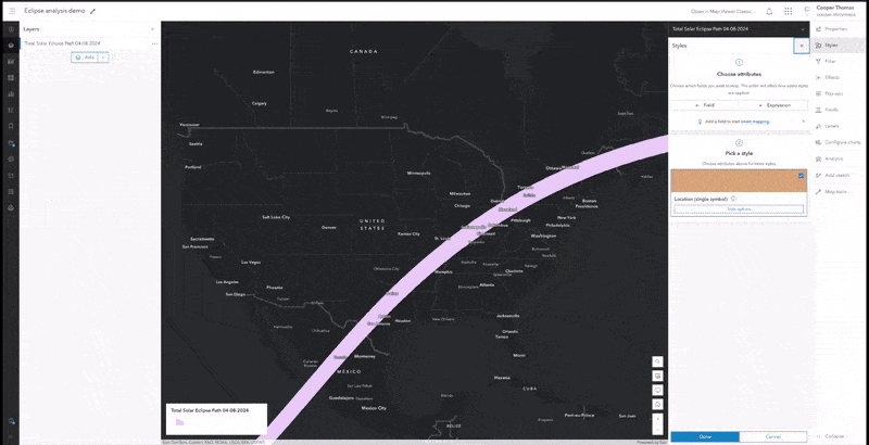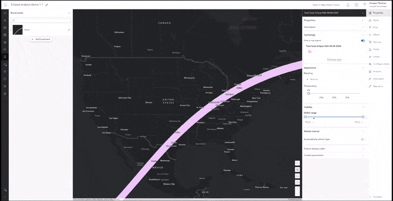 We recently published Mapping the eclipse: A journey through darkness, a story that explores the path of the total solar eclipse on April 8, 2024. This article covers three different Map Viewer-based workflows that we used to highlight certain geographic features and phenomena relevant to this exceptional event.