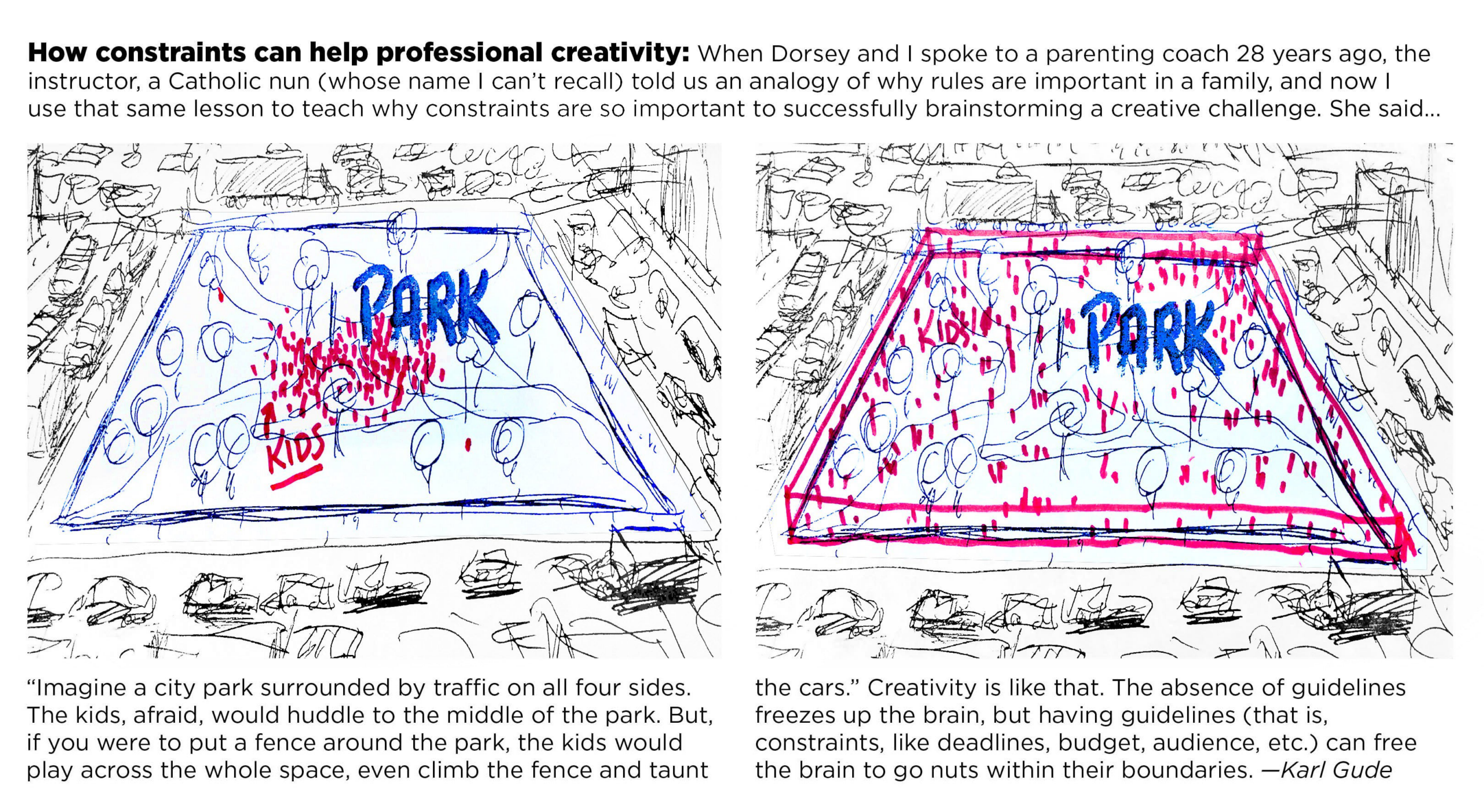 One of my professors at Michigan State, Karl Gude, provided this great analogy about kids playing in a town square surrounded by roads: If there’s nothing separating the kids from the road and traffic, they naturally avoid the edges of the square, and constrain their play to the center. But if a fence is built around the square, then the kids will use the full extent of that space to play. This applies to the real world as well: Constraints can help us expand what we’re doing.