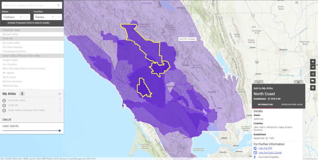 Because many AVAs have overlapping boundaries, the ability to compare AVAs was critical. Contained within a pop-up is information about overlapping AVAs, effective dates, and geographic extent. From the pop-up, users can also link to the CFR—which is still the official record— view the public docket of petitions and rulings, and download the shapefile of the AVA.