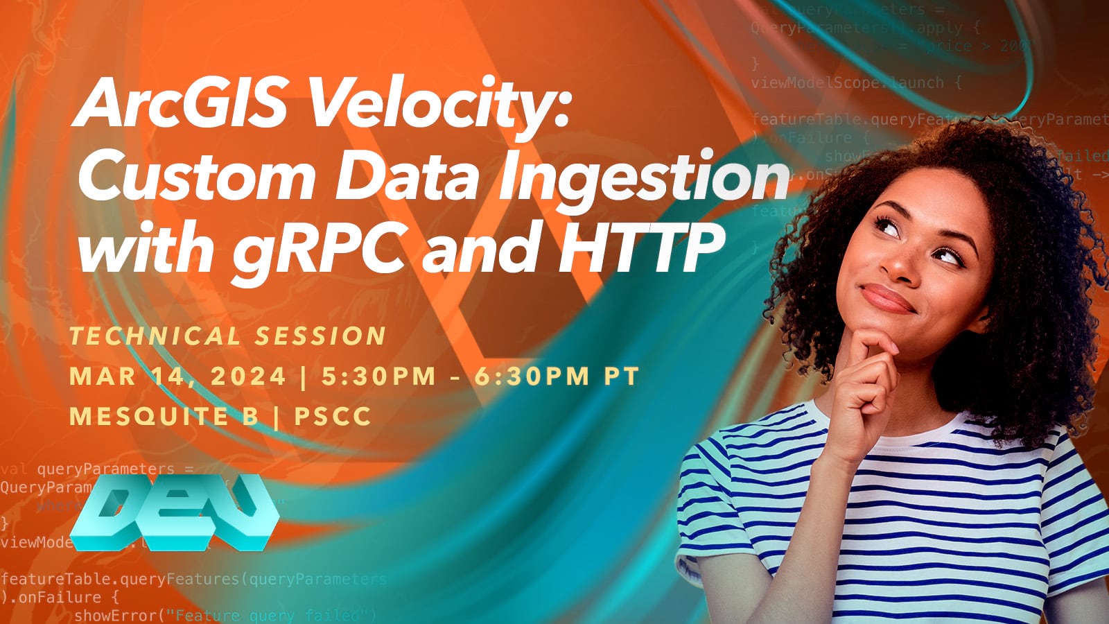 Topics will include exploring gRPC developer resources, required client libraries, data packaging examples, and connecting to a gRPC feed to update features in a web map. In addition, you will learn how ArcGIS Velocity supports real-time data ingestion and egress or actuation through HTTP, which enables you to integrate with third-party APIs. Topics will include how to configure HTTP Receiver inputs, HTTP outputs, URL parameters, authentication, and custom headers to interact with external APIs and systems through HTTP.
