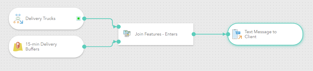When the delivery vehicle enters a 15-minute drive time area around the delivery address, the Join Features tool can detect the ‘enter’ event and join attributes about the order to the vehicle feature in order to provide the necessary fields for the outgoing message’s address, subject and body. Join Features can act as a data filter or a data enricher by leveraging the option to return all target features or only those that satisfy a join. See our documentation on Join Features.