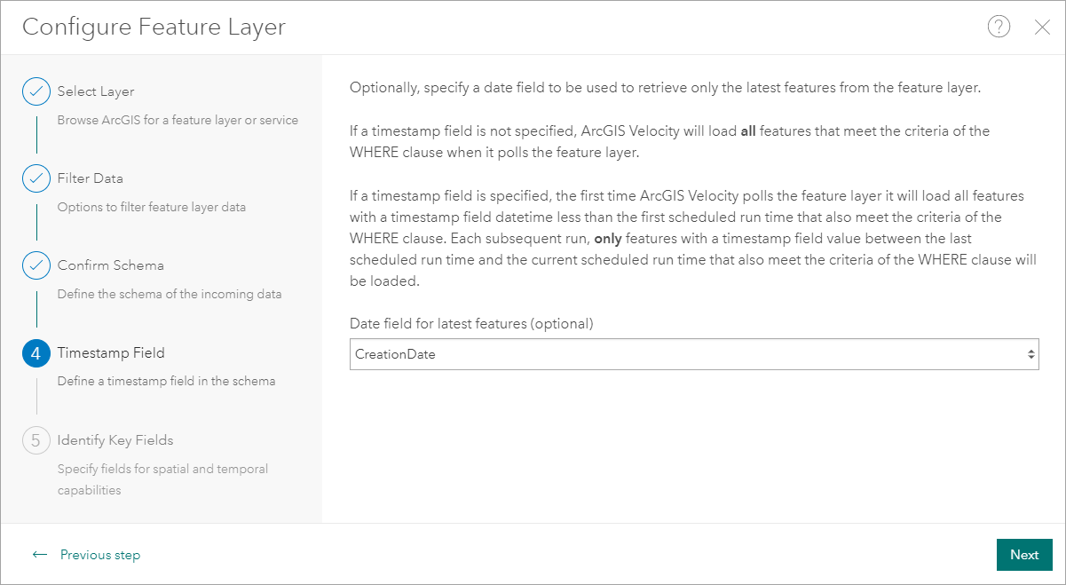 Our feature layer has editor tracking enabled, and therefore has a CreationDate for each feature. We’ll choose this field as the timestamp field.