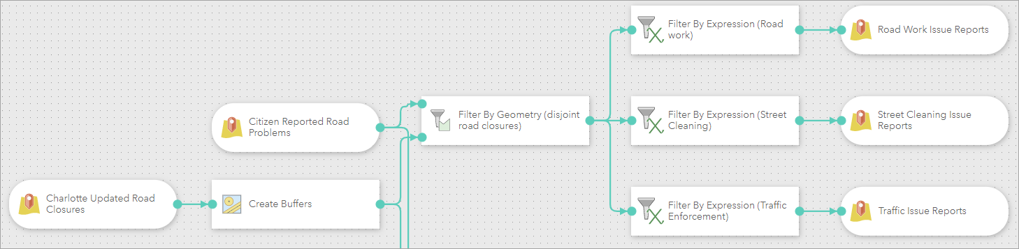 Now that we’ve identified features that are not near road closures, we want to split reported issues based on their type, so they can be directed to the Road Work & Maintenance, Street Cleaning, or Traffic Enforcement departments accordingly. This is accomplished using three different Filter by Expression tools.