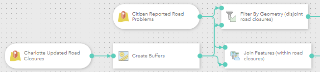 At this point, we still need to process citizen reported roadway issues that are not within the proximity of a road closure. To achieve this, we’ll configure a Filter by Geometry tool with a disjoint spatial operation from the buffered Charlotte Street Closures. This isolates the citizen reported roadway issues that are not within 100 feet of road closures.