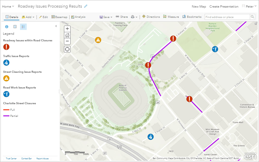 Now, let’s take a closer look at how you can perform near-real-time analysis in ArcGIS Velocity. In this scenario, we’ll assume the role of a city transit department, in this case in Charlotte, North Carolina, and we’ll say we are working to more quickly and efficiently respond to citizen concerns and issues regarding public roadways. Let’s assume that the city’s GIS department has already configured a GeoForm configurable app to collect issue reports. This app provides the citizens with an easy-to-use interface to report issues such as potholes, missing signs, debris on road, and more.