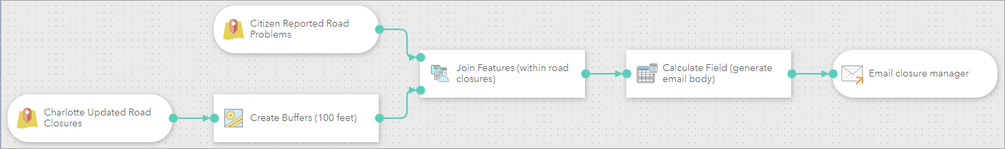 After joining and enriching the reported issue with information from the road closure, an email body is generated using the Calculate Fields tool and the process concludes with an Email output. As a result, any citizen reported issue feature that falls within 100 feet of a city road closure will trigger a notification email with relevant details to the site manager of that road closure.