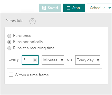 With this setting when the analytic is started the first time, ArcGIS Velocity polls the feature layer and will load all features with a timestamp field datetime less than the first scheduled run time that also meets the criteria of the WHERE clause. For each subsequent run, only features with a timestamp field value between the last scheduled run time and the current scheduled run time that also meets the criteria of the WHERE clause will be loaded.
