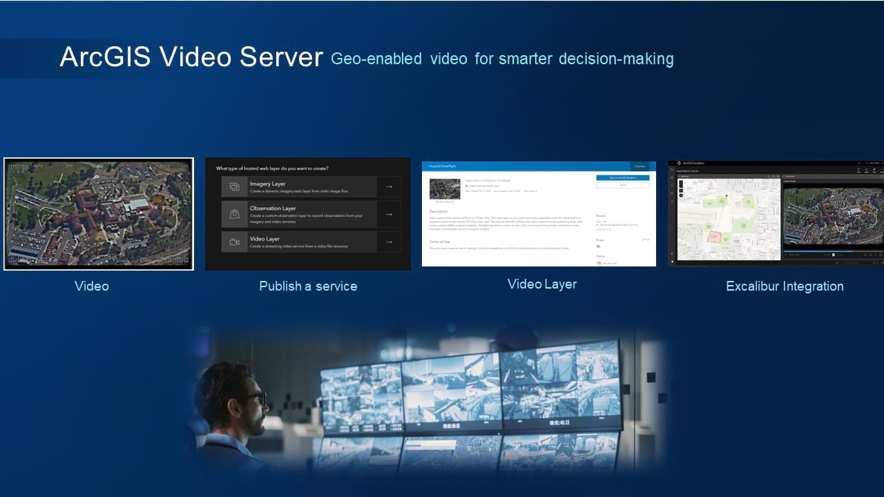 ArcGIS Video Server allows users to publish videos and service enables them for use over the web as the new video layer in ArcGIS client applications. As we move into 2024, more client applications will add support for the video layer, but at this initial release our client application is ArcGIS Excalibur.