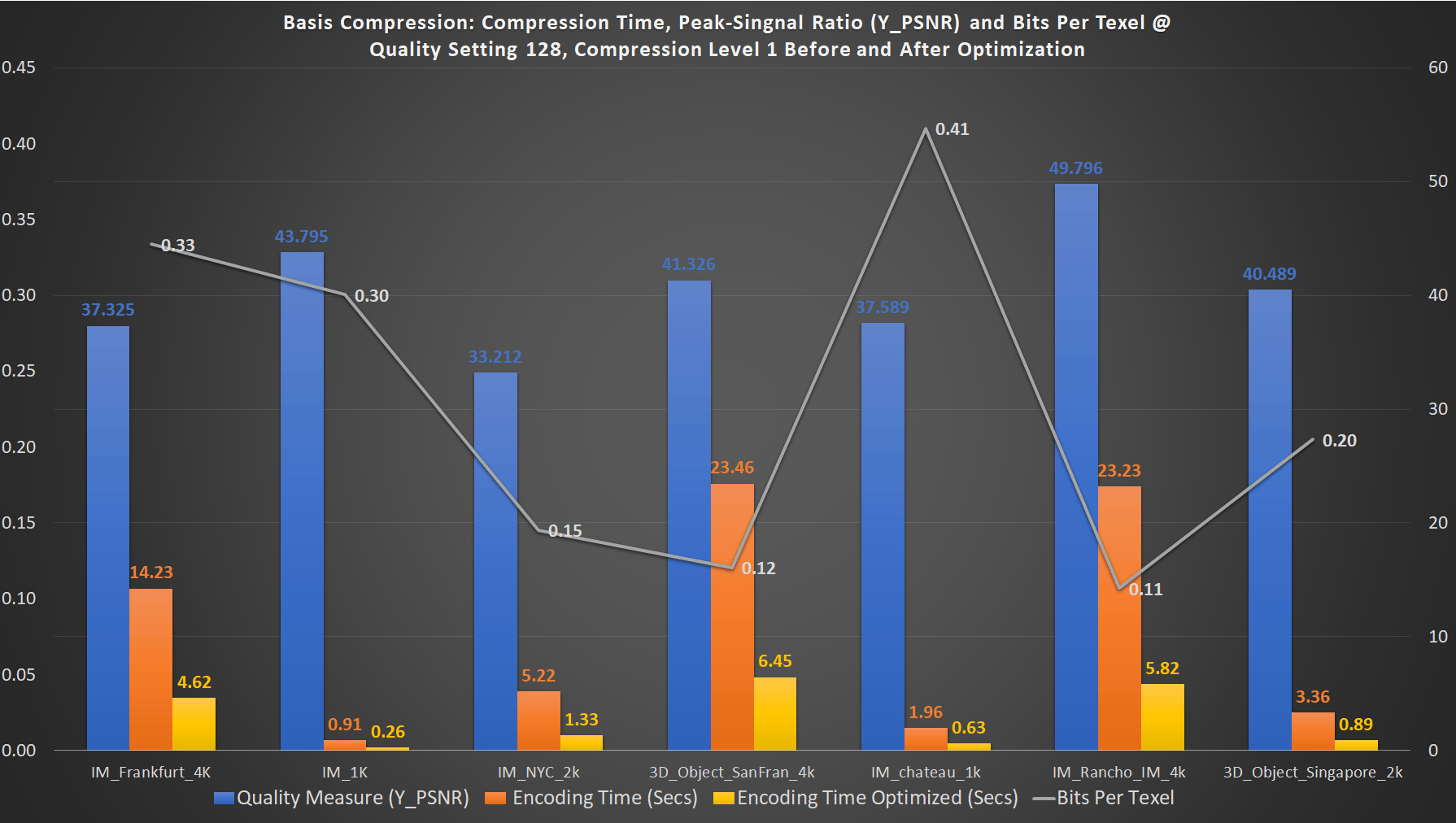 The chart above shows encoding performance and quality using the Basis encoder before and after optimization. Texture quality is represented by the blue bar graphs showing Y-PSNR of the texture, where typical values are in the ranges of 30 – 50 dB. Total encoding time to the basis format are represented by the orange (unoptimized) and yellow (optimized) bar graphs, using Version 1.12 and Version 1.13 Basis codebases, respectively. Note that the total encode time includes also the decompression time from JPEG/PNG input source format to RGB/A as well as to the basis file format. The Bits per Texel (basis file size in bits/texel count*Num Channels) is represented as a line graph to account in differences among different sized texture atlases.