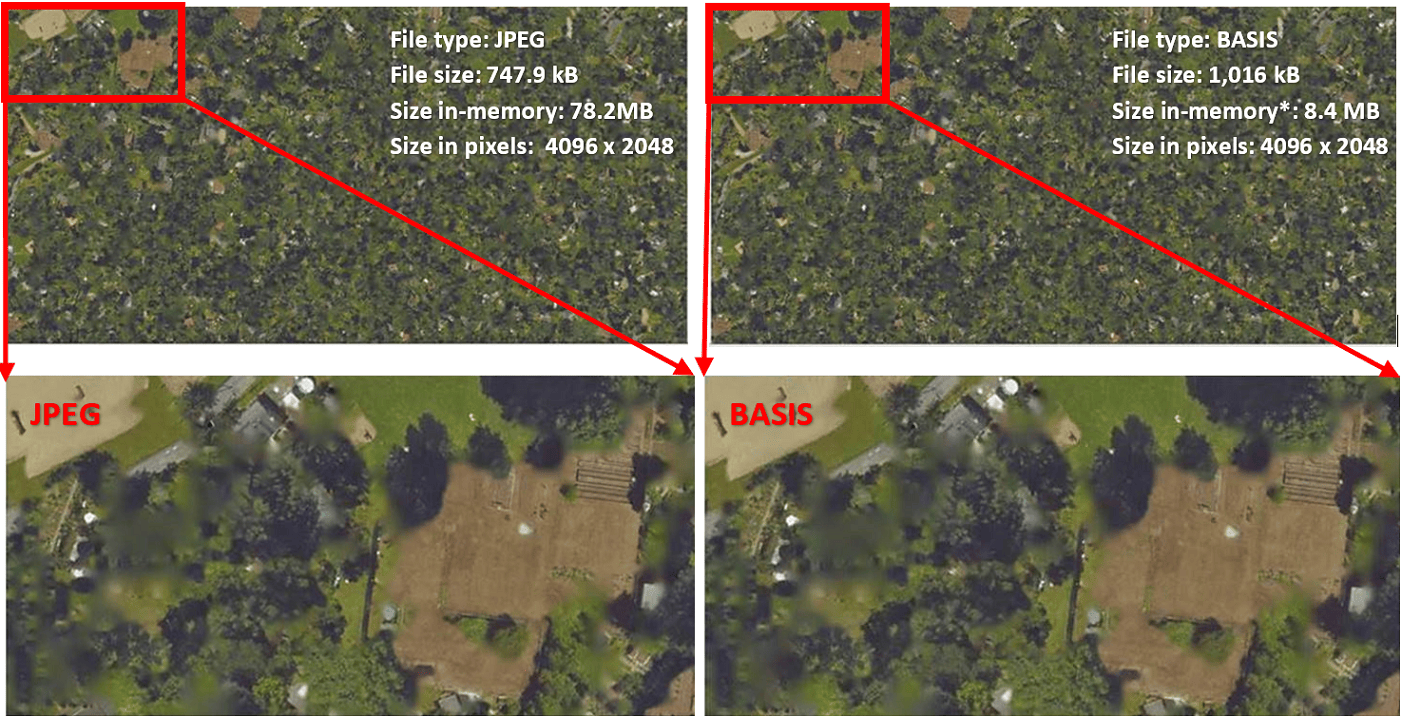 One of the key features of IntegratedMesh and 3D Object Scene Layers in I3S include support for compressed texture formats such as DXT and ETC2, as GPU native texture asset resources. Compressed textures bring massive reduction in client application memory since they are directly loaded in the GPU without having to be uncompressed to RGB/A. This affords the consuming application much-less memory utilization and avoid the CPU cycles required to decompress highly compressed image formats such as JPEG and PNG.