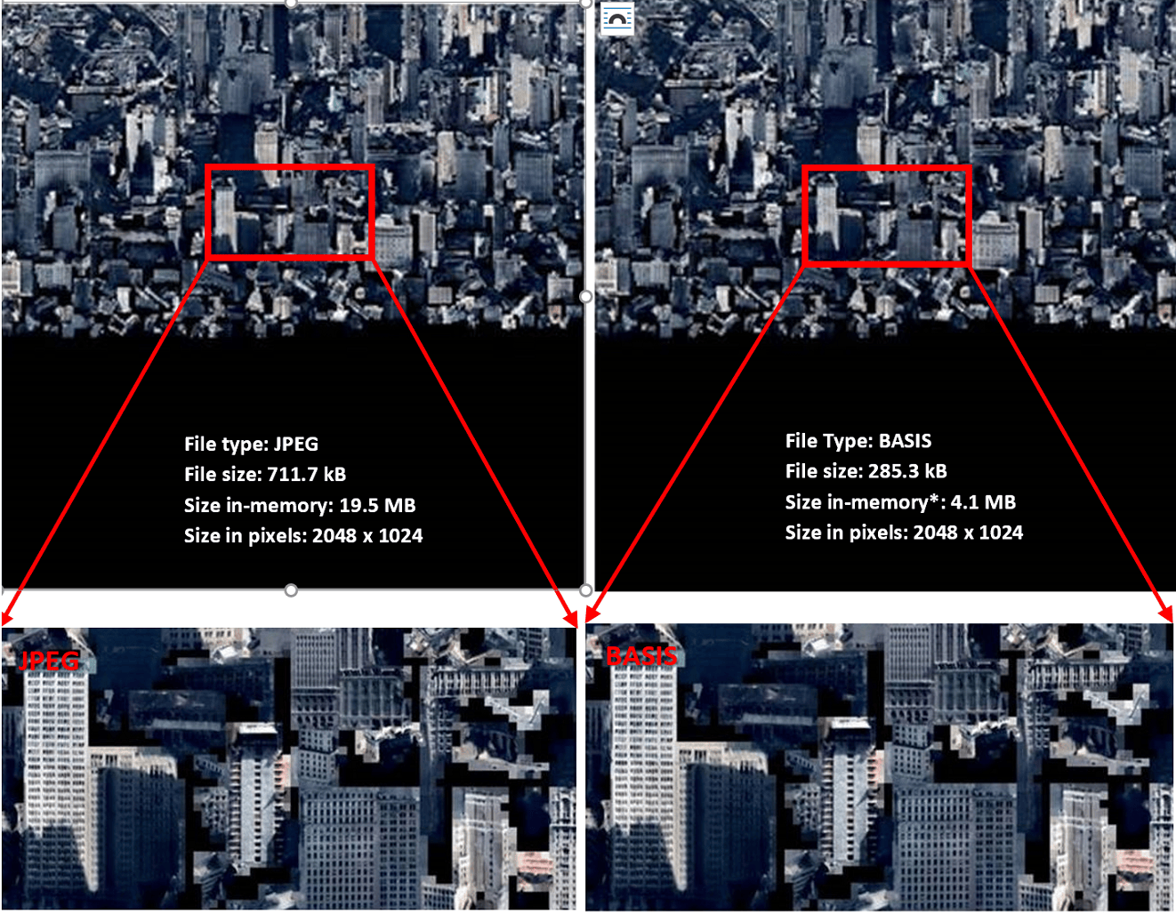 Basis Universal is a GPU optimized texture compression format that significantly reduces the image storage size while keeping highest quality. Basis Universal texture format is 6-8 times smaller than JPEG on the GPU yet is a similar storage size as JPEG – making it a great alternative to current GPU compression methods that are inefficient and do not operate cross platform – and provides a more performant alternative to JPEG/PNG.