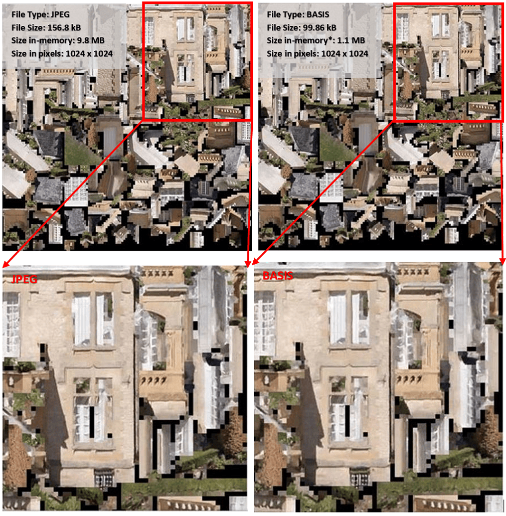 Performant 3D systems routinely utilize compressed textures, as an essential optimization technique to support the loading and display of massive amounts of textures in 3D applications. Indexed 3D Scene Layer (I3S) supports various compressed texture formats for that purpose targeting different platforms. With wider adoption of GPU-decodable Supercompressed Textures (GSTs) such as Basis Universal, gone are the days where 3D systems had to greatly compromise on texture quality, bloated texture asset sizes and various formats when using compressed textures. Basis Universal allows for excellent decoding speed, great compression rates while keeping the visual quality and works cross platform. In this blog, we are pleased to share a collaboration effort with Binomial that improved Basis Universal encoder speed by a factor of at least 3X! We also show a sneak preview of Basis Universal texture support as an I3S compressed texture asset.
