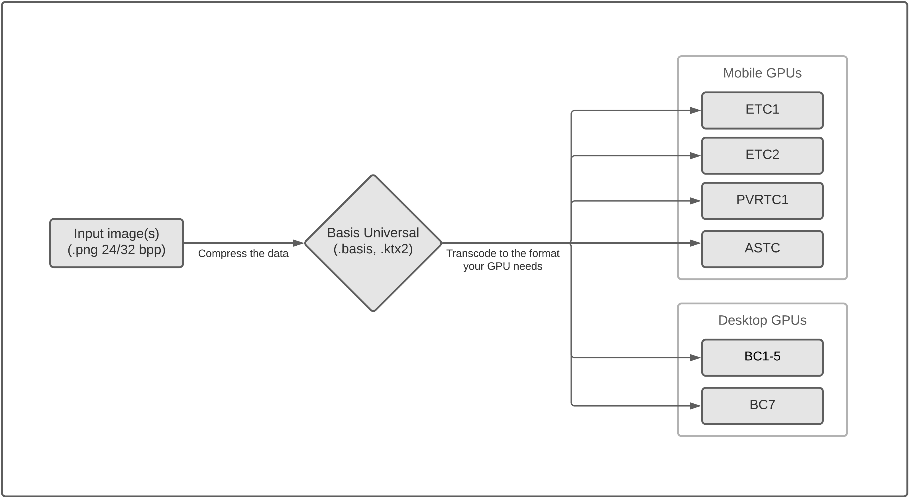 Until the introduction of GSTs – GPU-decodable Supercompressed Textures, GPU native compressed image generation was extremely specialized and was tightly coupled to specific hardware/platforms. Before GSTs, there wasn’t much option other than redundantly generating the same texture and distributing it in the various compressed texture format flavors targeting specific platforms.