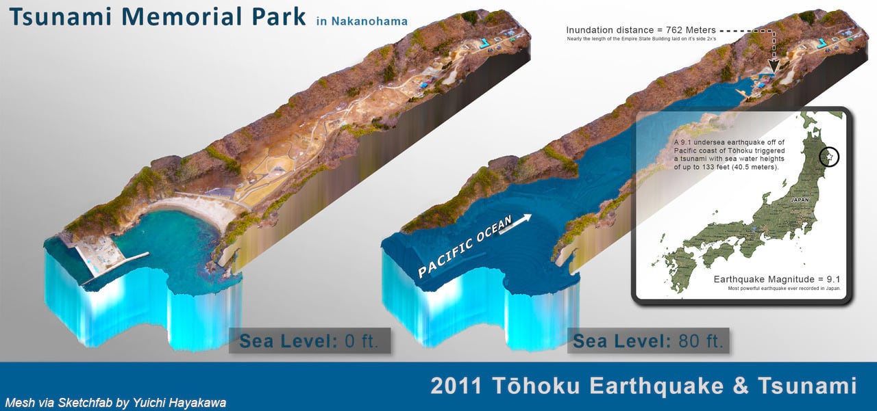 While ArcGIS offers a robust set of Overlay capabilities, Adobe Photoshop is great way to create pixel-perfect and print ready work. Below, the flooding of a park near Sendai in the Tonoku Region is highlighted with the use of Photoshop.